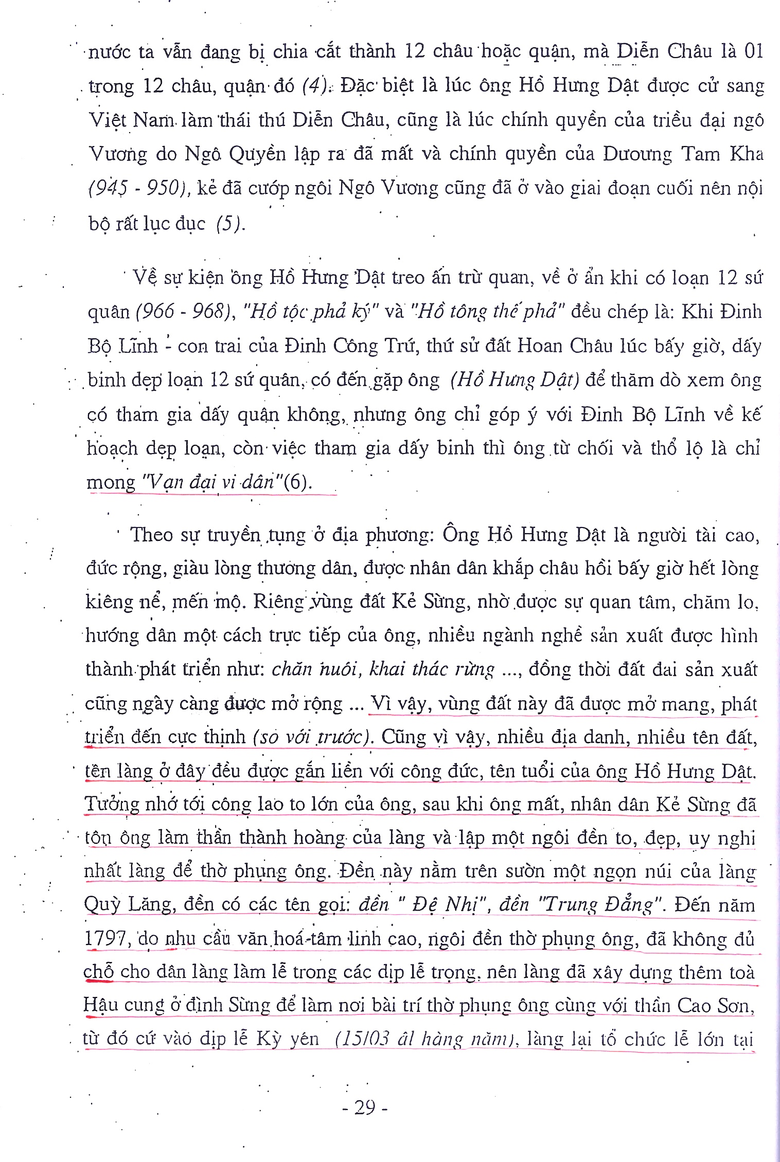 5. Bào Đột, Ngọc Sơn vùng này thế kỷ 10 còn rừng rú âm u, sao từ Quỳ Lăng – Lăng Thành ông Hồ Hưng Dật lại ra đây (xa và khó đi) và sao không thấy dấu tích gì? và về phong thủy cũng không phát… Sách Quỳnh Đôi cổ kim sự tích hương biên ( XB- 2005, tr 35) có ghi: “Đời Long Đức vua Lê Thánh Tông (1732-1735) có thầy địa lý người Tàu đi qua địa phận làng Quỳnh Lâm, đứng ở chân núi Tùng (rừng thông) nói rằng: “Ngàn Tùng được khí đất thì cỏ cây xanh tốt, chứ người không phát đạt”. Ông thầy ấy lượn đi lượn lại, nghĩ ngợi xa trông chỉ làng ta (Quỳnh Đôi- HBT) mà nói rằng: “ Thử địa cát, thử địa cát, công hầu thát thát”, có nghĩa là đất làng ấy hay, đất làng ấy hay, công hầu san sát” (gia phả của quan Hiến phổ ở làng Hoàng Trường biên vậy)”… Như vậy về mặt địa lý phong thủy vùng Quỳnh Lâm, hay Ngọc Sơn, Thượng Đột nay được khí đất thì cỏ cây xanh tốt, chứ người không phát đạt. Xưa cụ Hồ Hưng Dật thông thạo phòng thủy là sao cụ lại chọn làm nơi sinh sống lâu dài và làm trại chủ?