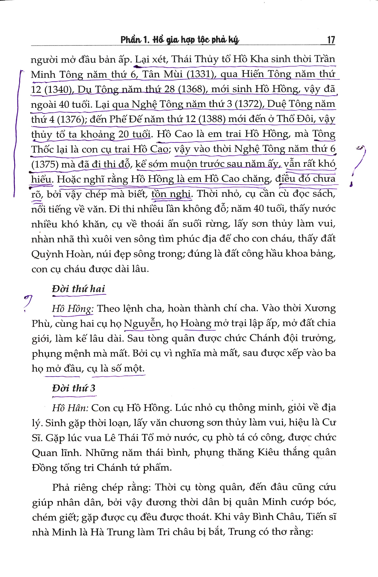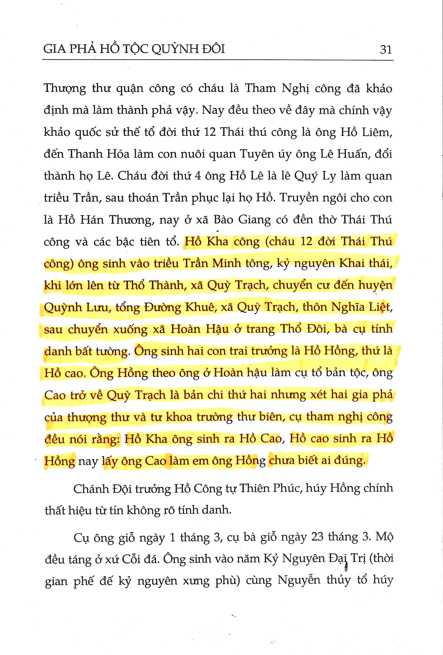 (c) “Hồ Cao là em Hồng (vì theo họ Hồ Quỳnh Đôi: “Hồ Kha sinh 1325, Hồ Hồng sinh 1358 là anh Hồ Cao sinh 1360”.