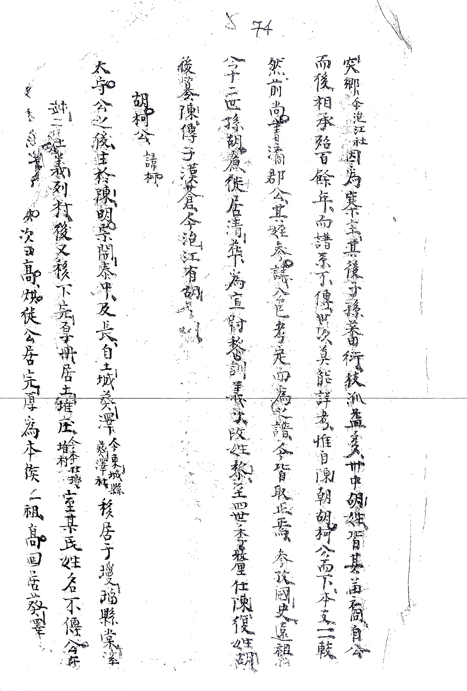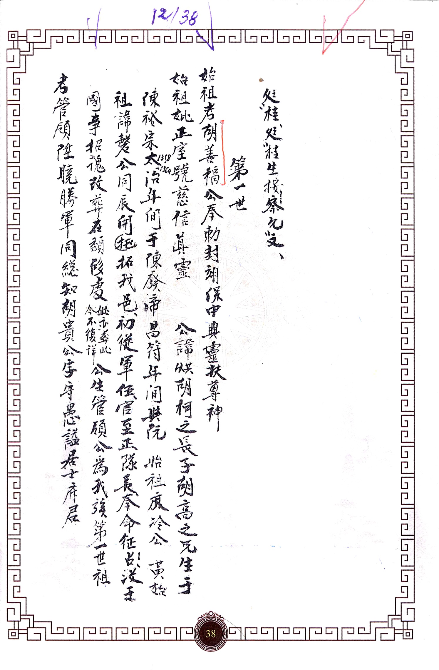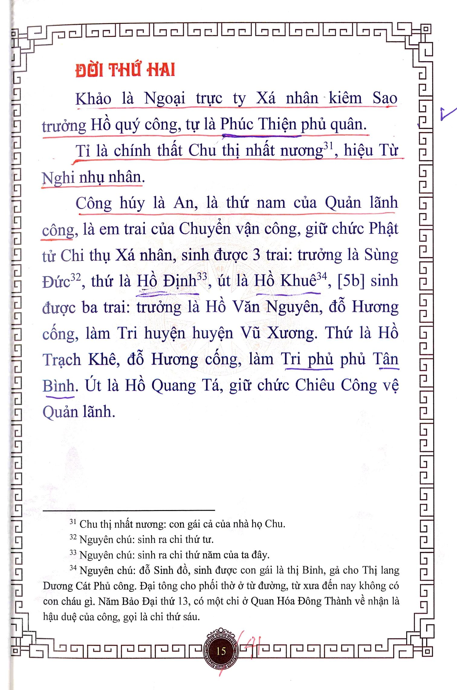 “Đời thứ hai: Khảo là Ngoại trực ty Xá Nhân kiêm Sao trưởng Hồ Quý công tự là Phúc Thiện phủ quân. Tỉ là chính thất Chu thị nhất nương, hiệu Từ Nghi nhụ nhân. Công húy là An, là thứ của Quản lĩnh công”.