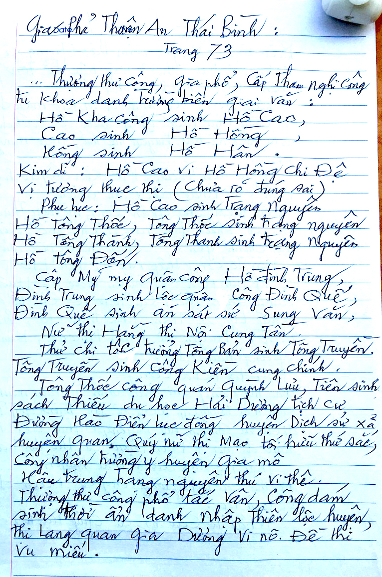 Tồn nghi (a) đã phát lộ nhiều chứng cứ tin cậy có cơ sở thực tế khách quan khoa học, theo gia phả cổ Hán Nôm họ Hồ đại tôn thôn Thuận An (Thái Bình) trang 73, dịch nghĩa là: